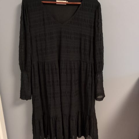 Vakker, mørkeblå kjole frå Cream i eit litt tjukt stoff med god stretch. Kjolen er 90 cm lang, har 3/4 arm og eit vakkert og dekorativt holmønster på armane og øverste delen av ryggen. Aldri brukt, som ny.