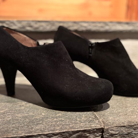 Hæler i størrelse 38 med grå farge og detaljer i slangeskinnsmønster på hælen. Laget av semsket materiale med elastiske paneler på sidene for bedre passform.