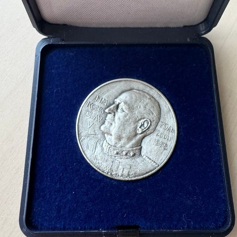Norsk minnemynt 1991. Myntene er gullbelagt og har motiv av kong Olav V og kong Harald V. Kjøpt fra Samlerhuset.