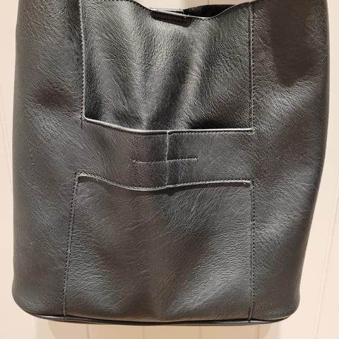 Skulderveske i svart farge. Vesken har to håndtak og en avtagbar skulderrem. Innvendig er det flere lommer.