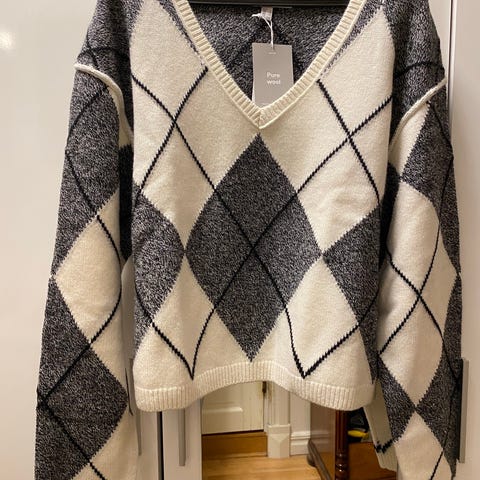 Argylemønstret genser i 100% ull fra H&M Premium Selection. Str L. Lappen henger fortsatt på, nypris 799kr. Modellen på bilde 4 og 5 har på str M. Hentes hos meg eller sendes mot at kjøper betaler frakt😊