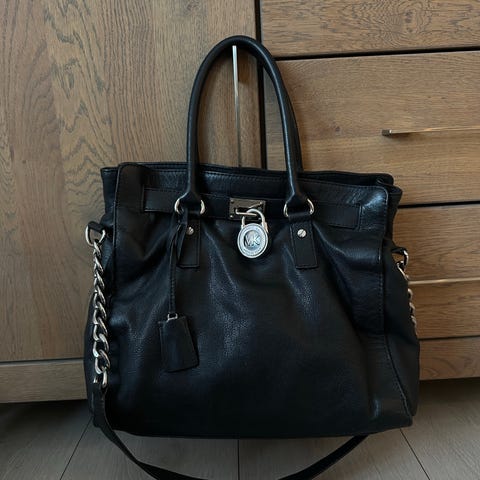 Michael Kors skulderveske laget i lær med krokodillemønster. Vesken har en rund hengelås med Michael Kors-logo, to bærehåndtak og en avtagbar skulderrem med lenkedetaljer. Innvendig finnes flere lommer for organisering, inkludert glidelåslommer og åpne lommer. Vesken er designet for dame.