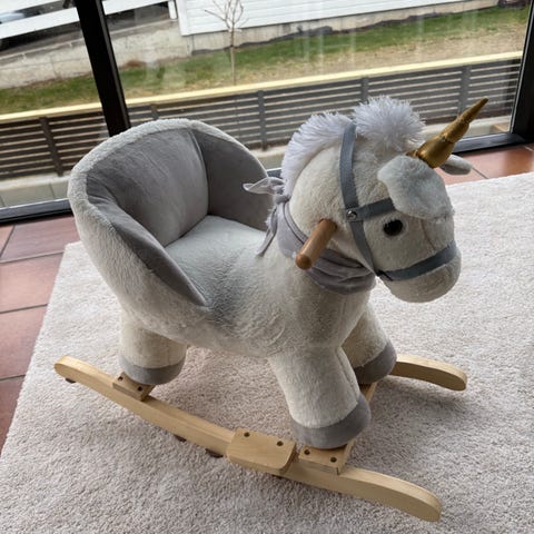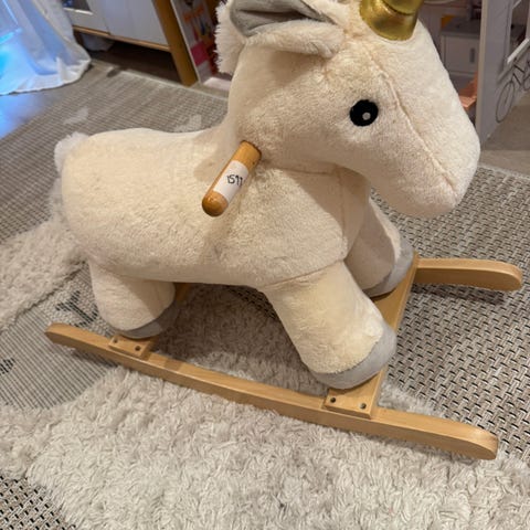 Kjempe søt gyngehest som er en enhjørning. Er med navn på men dette kan fjernes.