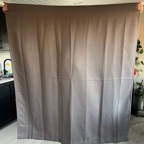 Selger to lengder med gardiner fra Kid. Gardinene er beige med et mønster i gullaktig tråd som gir en fin skinnende effekt. Selges for 100 kr pr. stk.