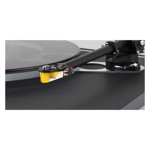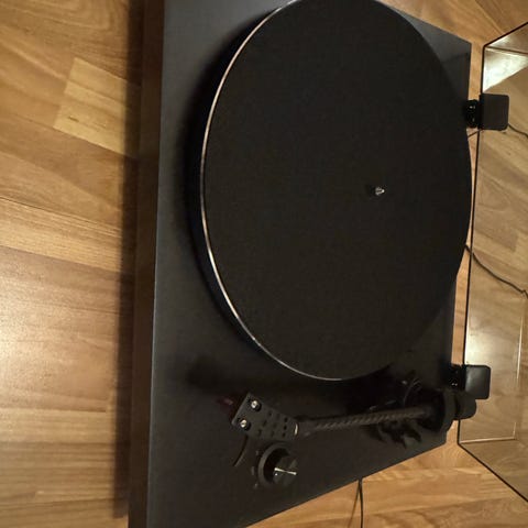 Rega Planar One platespiller med svart finish. Platespilleren har en enkel og funksjonell design, egnet for avspilling av vinylplater.