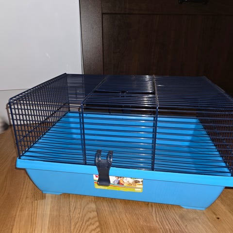 Det er ett plast bur for smådyr med plastbunn og metallgitter. Buret har en plastbunn i blått og en overdel med metallgitter, samt en transparent plastdeksel. Passer til små kjæledyr. Er også med mange leker og hus passer fint til hamster og mus. Det er også med rør som går utenpå buret og eller så kan man ha det som man vil inni. Buret er nokså stort men ikke stort nok til å ha marsvin. Det følger også med ett lite plastbur