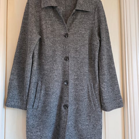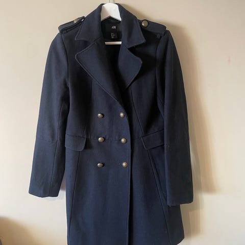 Svart, innsvingt dobbeltspent ullkåpe fra H&M. Stoffet er tykt og holder fint på fasongen. Ullblandingen er 80% ull og 20% polyamide. Kåpen er pent brukt. De originale ekstraknappene følger med påsydd på lappen inne i kåpen for evt. fremtidig behov for reparasjon. Det originalet beltet på kåpen har forsvunnet, men jakken er også veldig fin uten beltet. En slik jakkemodell omtales gjerne som skipperjakke eller peacoat. Den har knapper på skuldrene.