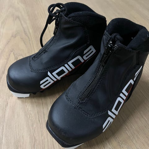 Alpina langrenn skisko i fargene hvit og rød. Skiskoene har glidelås foran og knyting innerst.