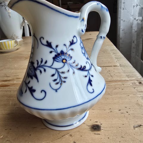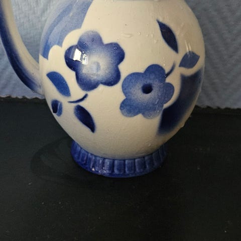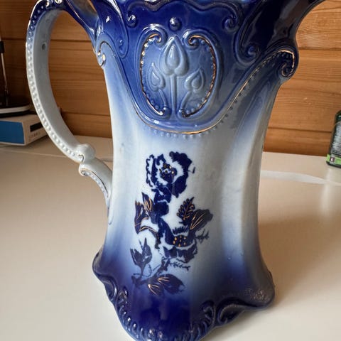 En vakker, håndlaget porselensvase fra Kislovodsk, Russland. Vasen er i nyanser av hvitt, kobolt og gull.