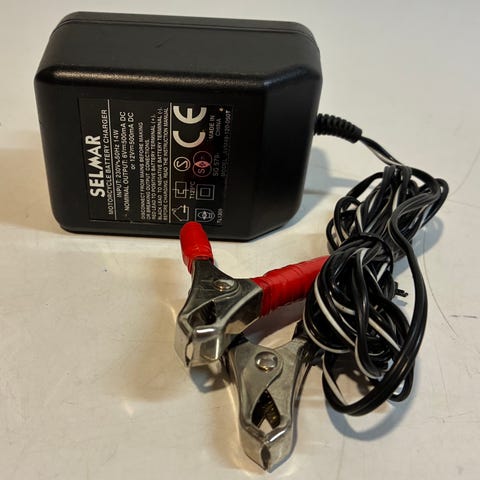 Lader med 5-pins kontakt. Kabelen har en rund 5-pins plugg for tilkobling. Enheten har indikatorlamper for status.
