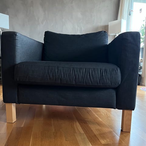 Pent brukt ørelappstol, (blå), med oppbevaringspuff.