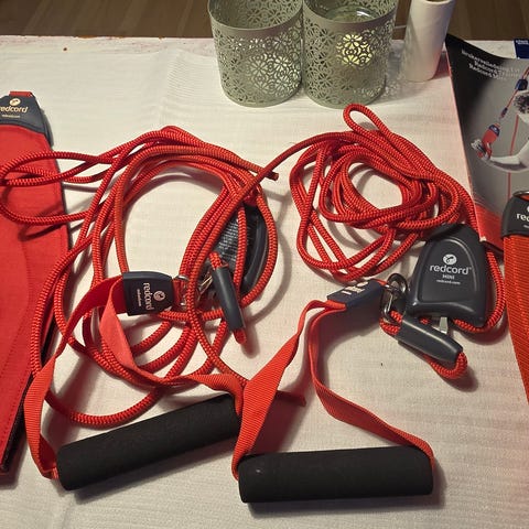 Redcord treningssett med stropper og slynger for hjemmetrening. Har hatt den en lang stund, men kun brukt den noen få ganger. Alt fungerer fortsatt fint. Inkluderer håndtak, tau, festemidler og instruksjoner.