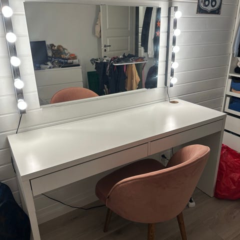 Veldig fint sminkebord til ungdom selges. Kjøpt i Desember så nesten ikke brukt. Speilet på sminkebordet er montert høyere enn den vanligvis skal så det er sittet 2 ekstra skruer på bakplaten.