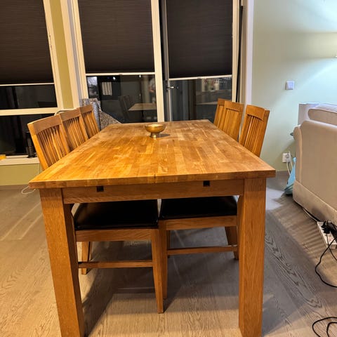 Jeg selger et pent spisebord, kjøpt på Skeidar. Bordet er i solid eike finer. Litt lystnet på midten av bordflaten men ellers veldig god stand. Ingen store merker. Stolene er i god stand. To tilleggsplater følger også med og da er det plass til 12 med begge platene. Uten plater er det plass til 8 personer. Selges pga plass mangel. Bordet må hentes og bæres ned 3 etg uten heis.