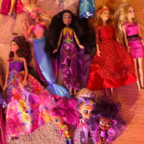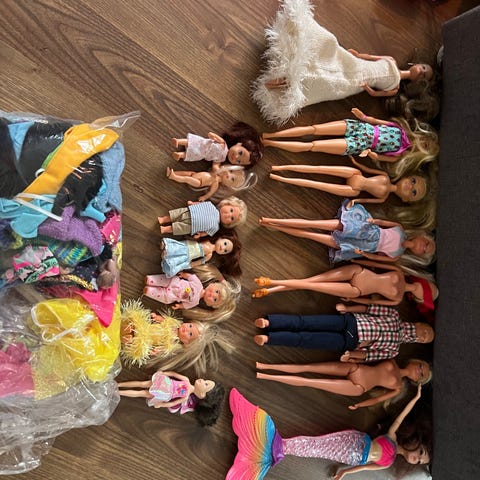 Min datter selger unda litt leker. Barbie assortert samling av dukker i ulike størrelser og utseender. Samlingen inkluderer flere dukker uten klær, med varierende hårfarger og frisyrer. Dukker egnet for barn som leker med Barbie-figurer.