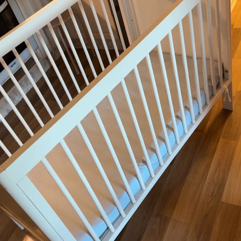 IKEA Sprinkelseng i tre med integrerte oppbevaringsskuffer under sengen. Sengen er hvit og er designet for barn. Passer for småbarn og gir mulighet for praktisk oppbevaring av sengetøy eller leker.