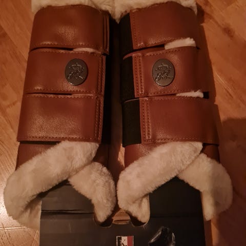 RHB dressurbelegg i hvit. Den ene bakbeinsgamasjen har fått et hull i stoffet(se bilder). Selges derfor billig
