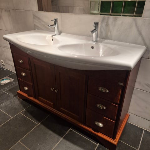 Servanten har noen mindre krakelleringer ut fra avløp, men lite synlig. Selges uten armatur og bunnventil. To porselenshåndtak følger med.