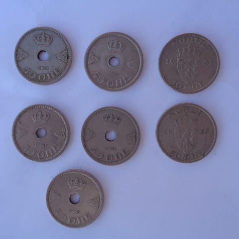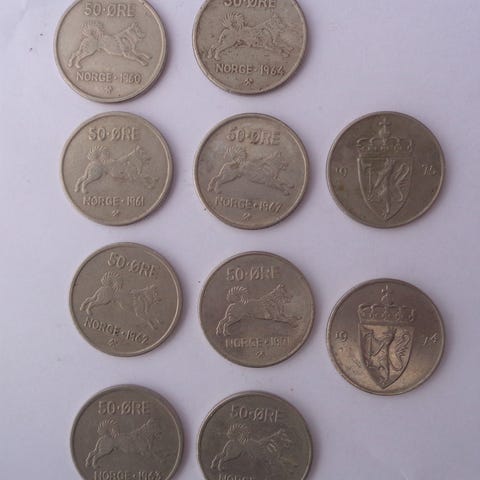 Sett med 21 norske 50 øringer fra 1949 til 1926