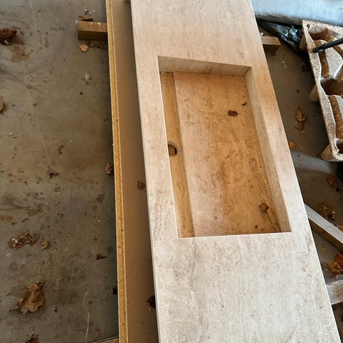 Håndlaget oval servant laget av marmor, med en glatt overflate og naturlig farge. Servanten har en sentrert avløpsåpning og er egnet for montering på benkeplate i baderom. Ny pris kr 8500,- 60*34 cm.