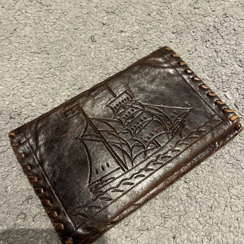Gammel lommebok med innpreget norske flagg og elg med fjell og sol i bakgrunn.