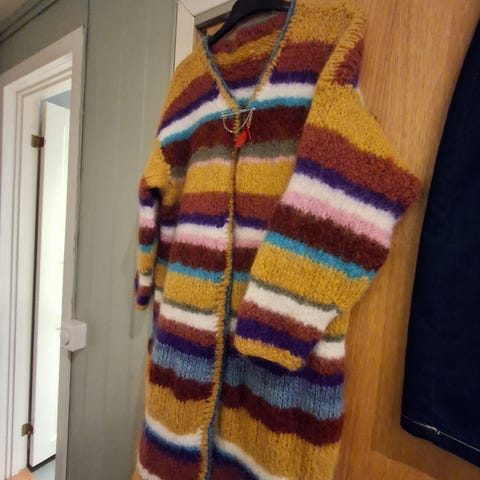 Hjemmestrikket mønstrete jakke selges for kr. 200,-. Er strikket i bomullsgarn. Har laget mønsteret selv, men er inspirert av jakke fra Odd Molly.