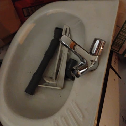 Servantskap 90cm i god stand med tilhørende vask, kran og toalettrull holder.