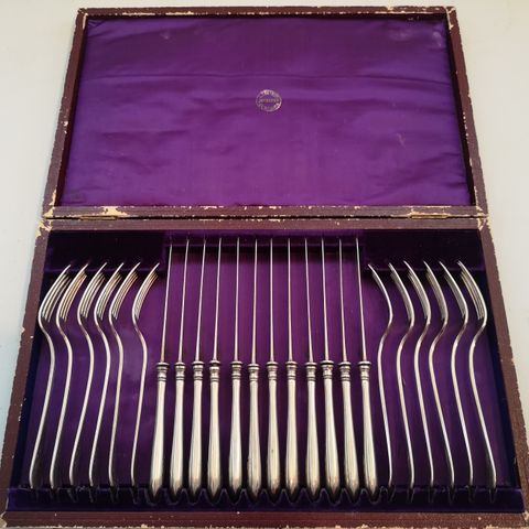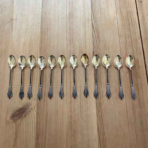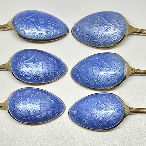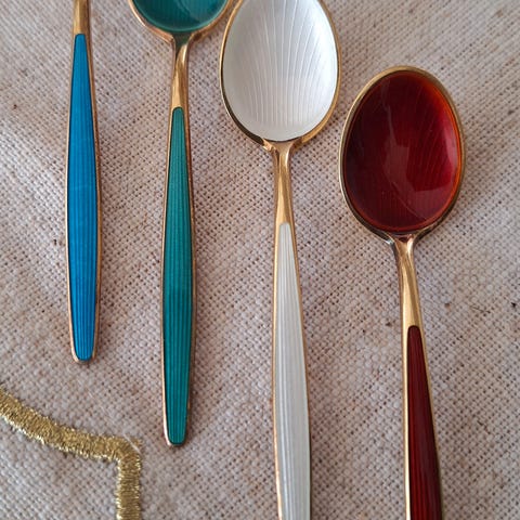 Emaljerte moccaskjeer i 925s fra David Andersen i sett med 6 stk. 2 av hver farge i fargene grønn, lilla og rød. Lengde 10 cm.