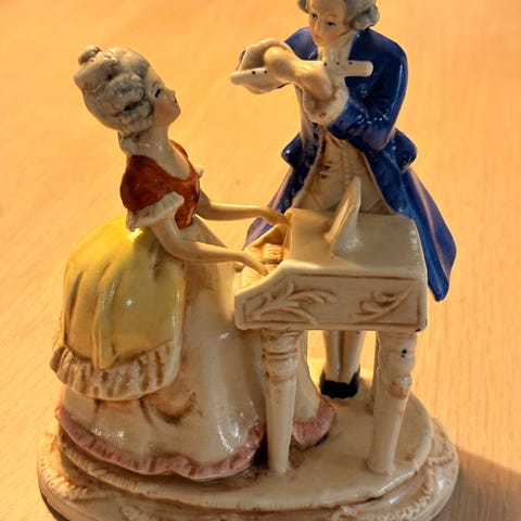 Dekorativ eldre porselensgruppe med dame ved klaver og herre med fiolin. Produsert i Øst-Tyskland (Made in GDR). Klassisk romantisk motiv, flott som pynt i stue eller vitrineskap.