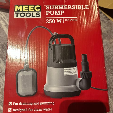 Meec Tools Submersible Pump med en effekt på 400W. Pumpen er utstyrt med IPX8-klassifisering og har en maksimal kapasitet på 8000L/t. Den er designet for nedsenking i væske og leveres med en tilkoblingsslange og flytekontakt.