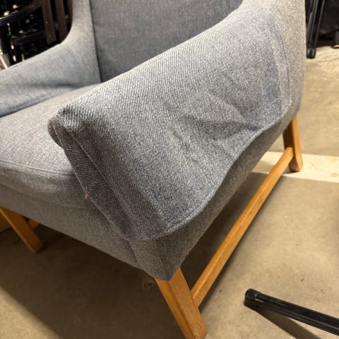 Godt brukt, men utenom slitasje på stoffet i det ene armlenet (som vist i bilde 1) er det ingen skader på den.