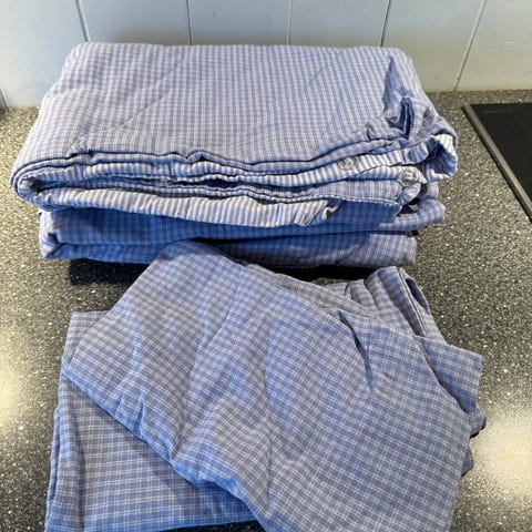 Sengetøy fra Home & Cottage, 2 sett. Hvit med blå og grå striper. Må syes litt i åpningen på det ene dynetrekket, se bilde. Selges samlet for 150,-
