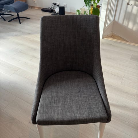 10 stoler med meget god sittekomfort i lys grå farge følger med. Målene på stolene er høyde fra gulv til sete er 47 cm. Fra sete til øverst på rygg 44 cm.