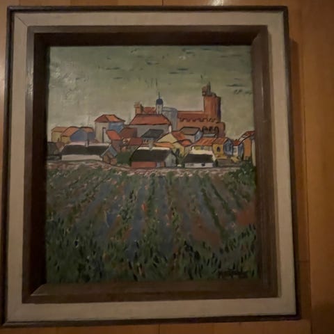 Maleri som viser et landskap med flere hus og et gjerde i forgrunnen. Bildet har en ramme i tre og farger som domineres av blått, grønt og brunt. Passer til dekorasjon i hjem eller kontor.