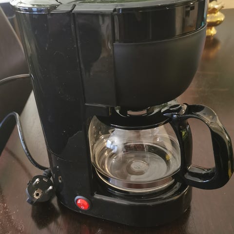 Kaffetrakter med glasskanne, svart og hvit farge. Utstyrt med måleindikator for vannivå. Passer til hjemmebruk for å lage kaffe. Fra Clas Ohlson. Pent brukt, ingen skader. Fungerer som den skal.