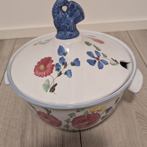 Suppeterrin med suppeskåler, det er 12 skåler brukt kun en gang å selges grunnet plassmangel ingen merker sprekker eller skader i servise.