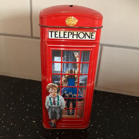 Sparebøsse i hvitt porselen selges . Høyde 12, bredde 15,5, dybde 8.