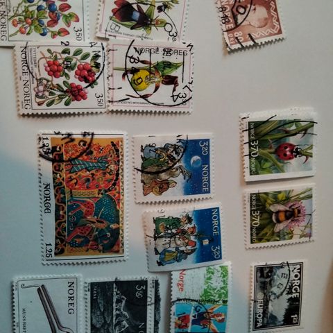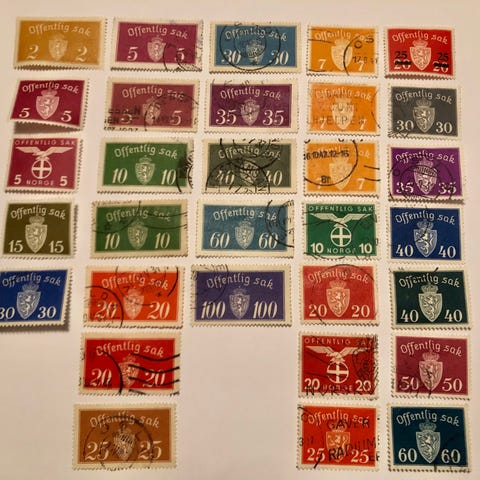 Samling bestående av fire norske frimerker med ulike farger og påtrykte verdier. Frimerkene er plassert på en svart bakgrunn for visning. Uten hengselrest. 8 sh. stemplet: Drammen.