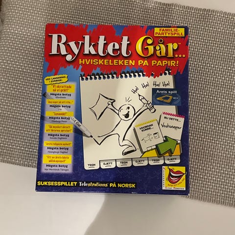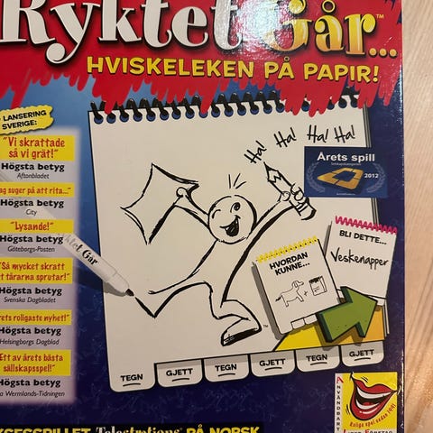 Ryktet Går brettspill norsk utgave. Spill med ulike spillkomponenter inkludert timer, terning, kort, og blokker for poengføring. Spilleregler på norsk følger med.
