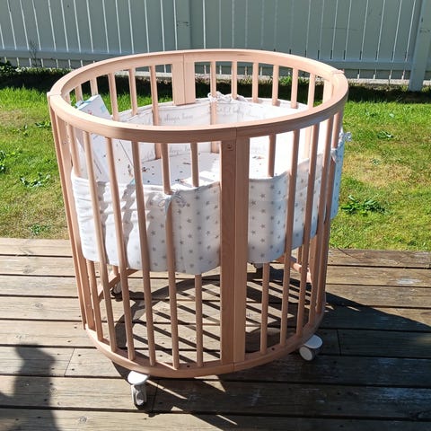 Stokke Sprinkelseng i den minste versjonen selges, egnes for bruk fra 0-6mnd! Den har et rundt design med hvit farge. Egnet for baby og har hjul for enkel flytting. Sengen har noen små skraper etter montering og bruk, har kun blitt brukt i 4 måneder av oss!