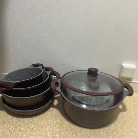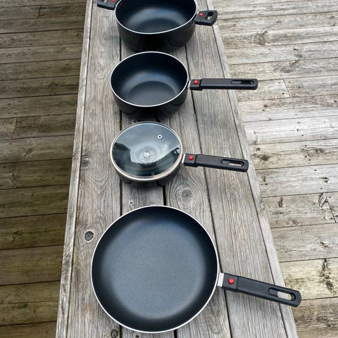 Gilde Invite grytesett med 5 deler, laget av svart aluminium. Grytesettet inkluderer kjeler i ulike størrelser med tilhørende glasslokk. Egnet for bruk på flere typer kokeplater, inkludert induksjon.