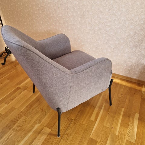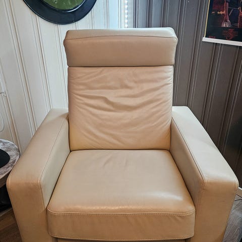 God å sitte i, men har slitasje på siden/under høyre armlen. Skinnet som har gått over krakken er også løsnet.
