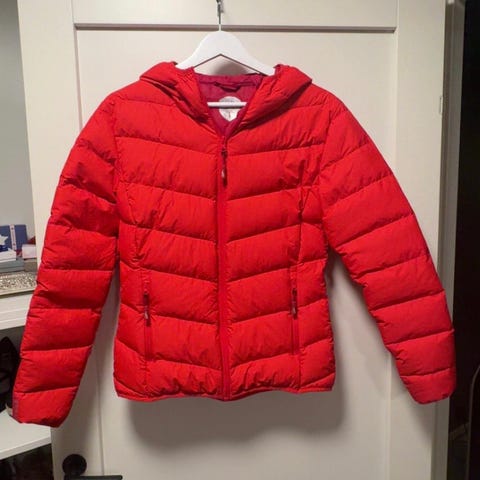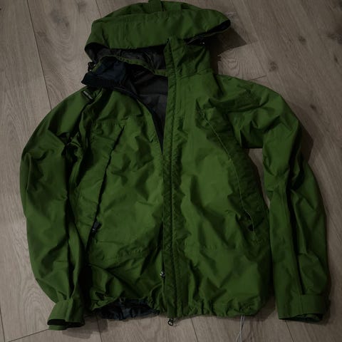 Haglöfs tynn ytterjakke i størrelse M for dame. Noe liten i str. Jakken er laget i Gore-Tex materiale og har en eplegrønn farge med mørk grønn teipet glidelåser. Kan med fordel vaskes, fremtrer i god stand uten mangler.
