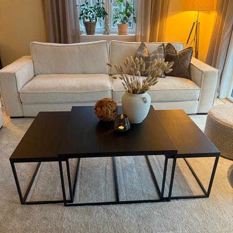Salongbordsett fra Home&Cottage selges. Bruksmerker på toppen, se bilder. Den stangen på det største bordet løsnet på ene siden så den er tatt av. Kan selvfølgelig fås med om en ønsker å prøve å feste den igjen, men har ingenting å si for bruken.