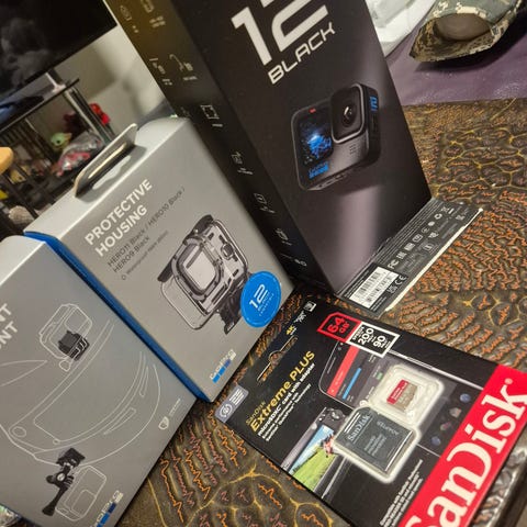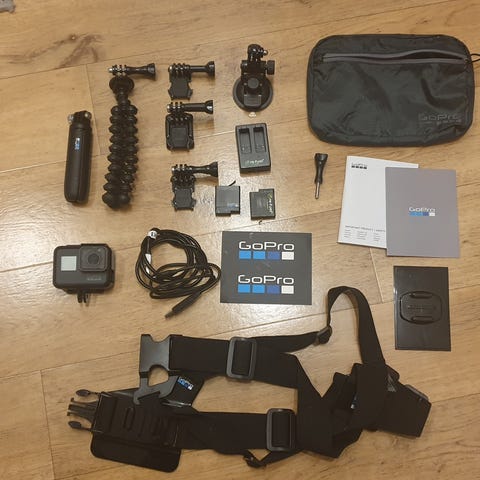GoPro kamera med tilbehør inkludert batterier, batterilader, linsebeskyttere og oppbevaringsetui. Kameraet er svart og beregnet for generelt bruk. Leveres med flere batterier og lader for utvidet brukstid. Kommer ikke med ssd cort aka gb koster 150 kr på power eller næermste elektroniske butik