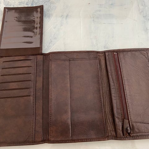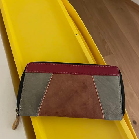 Oransje lommebok i kunstskinn med glidelåslomme og god plass. Ubrukt.