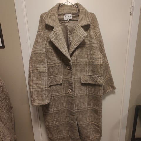 NA-KD Kåpe i størrelse 34 for kvinner, laget av polyester i beige farge. Kåpen har belte i livet og dobbel knappestilling foran. Den er designet med brede slag og lang lengde, egnet for bruk i kjøligere vær.