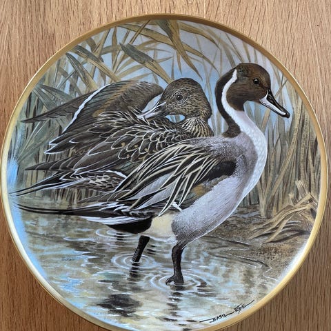 Selges et vakkert sett av fire samlertallerkener fra den anerkjente italienske porselensprodusenten Richard Ginori. Hver tallerken har et delikat fuglemotiv og en diameter på 22 cm. Richard Ginori, med sine røtter tilbake til 1700-tallet, er kjent for sitt håndverk og klassiske design. Dette er en flott mulighet til å skaffe seg unike tallerkener som vil pryde ethvert interiør og begeistre samlere.