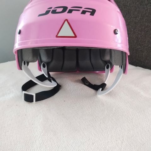 Jofa hjelm i hvit farge med ventilasjonsåpninger. Hjelmen har justerbare stropper for tilpasning.