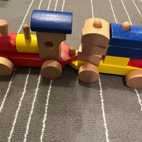 Djeco trelek tog med stableklosser i ulike farger og former. Leken består av flere sammenkoblede vogner med hjul og tau for trekking. Passer for små barn og kan brukes til utvikling av motoriske ferdigheter og lek. Inkluderer 4 tog og 30 klosser.